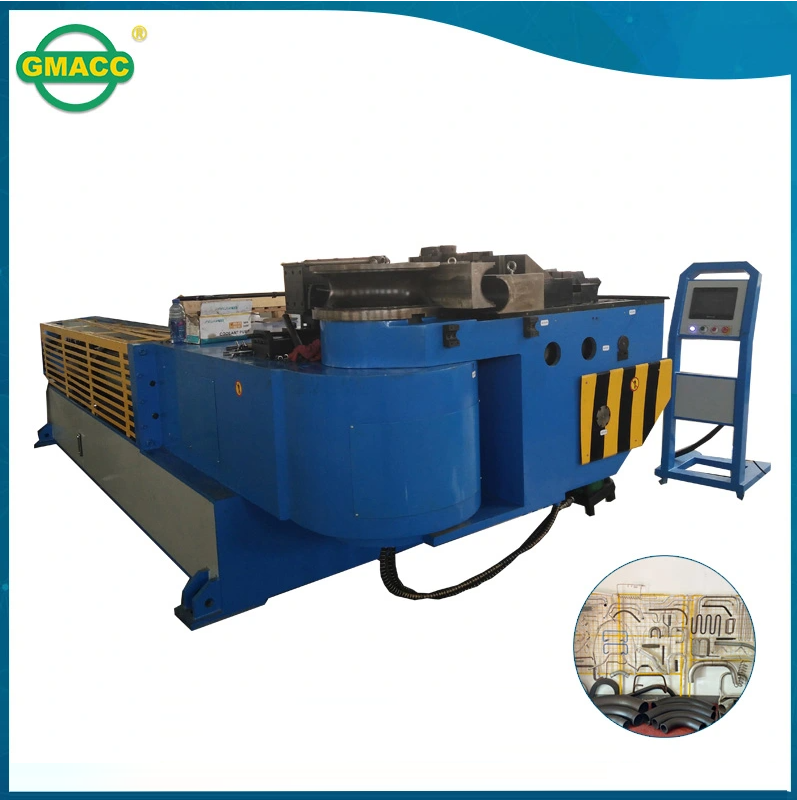 Azionamento completamente idraulico, controllato da PLC con touch screen o testo macchina piegatubi per tubi, dotato di dispositivi di serraggio del tubo, stampo guida, mandrino, antipiega, spinta assistita, piegatura del tubo e così via. Sotto il funzionamento idraulico, questo professionale, ad alta velocità e economico La piegatrice per tubi europea può piegare vari dimensione tubi metallici di forma sia normale che anomala e bgli angoli finali sono controllati da un codificatore importato ad alta precisione che garantisce l'elevata precisione di questa macchina.